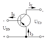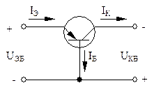 Из рис. 6.2 видно, что транзистор включён выводом базы к общей точке источников питания. Можно к такой точке подключить также эмиттер или коллектор. По этому принципу различают схемы включения транзисторов: с общей базой (ОБ), с общим эмиттером (ОЭ) и общим коллектором (ОК).