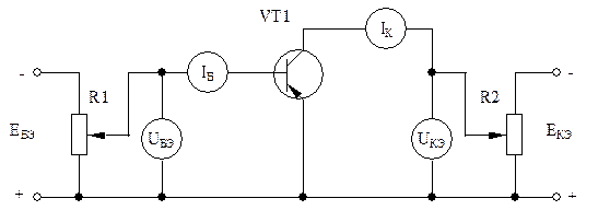 Схема содержит два источника питания: -ЕБЭ для базовой и -ЕКЭ для коллекторной цепи. Для изменения напряжения на базе предназначен переменный резистор R1, а на коллекторе – R2. Вольтметры и амперметры измеряют напряжения и токи базы и коллектора.
