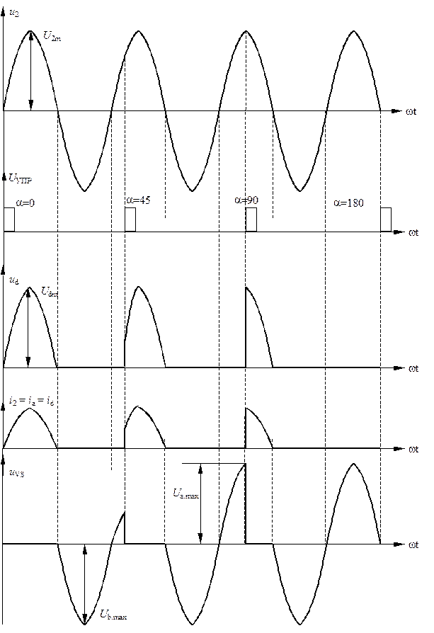 На пятом графике временной диаграммы изображено напряжение, действующее на тиристор. При a = 0 к тиристору приложено только обратное напряжение U b.max, которое достигает амплитудного значения напряжения вторичной обмотки и зависит от схемы выпрямителя (см. лекцию 3). Для рассматриваемого выпрямителя