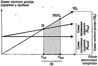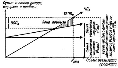 Из приведенного графика видно, что при запланированном объеме реализации продукции (Ртпп) предприятие может получить определенную сумму валовой операционной прибыли (ВОПп), на размер которой сумма чистого операционного дохода будет превышать сумму операционных издержек — как постоянных, так и переменных. График может быть интерпретирован и в обратном варианте: при запланированной сумме валовой прибыли (ВОПп) плановой объем реализации продук-