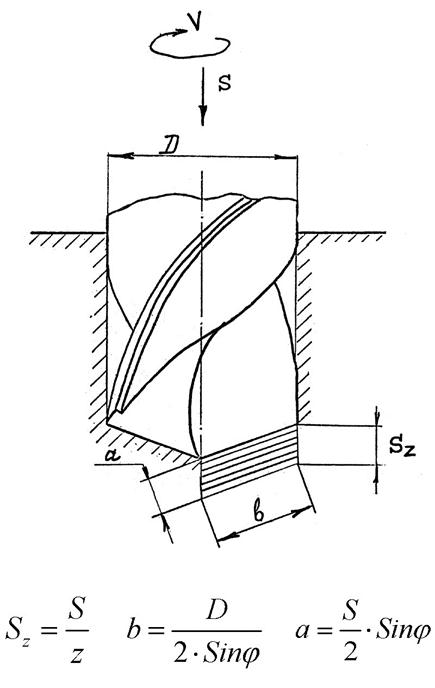 Каждый зуб сверла срезает слой металла шириной b и толщиной a.