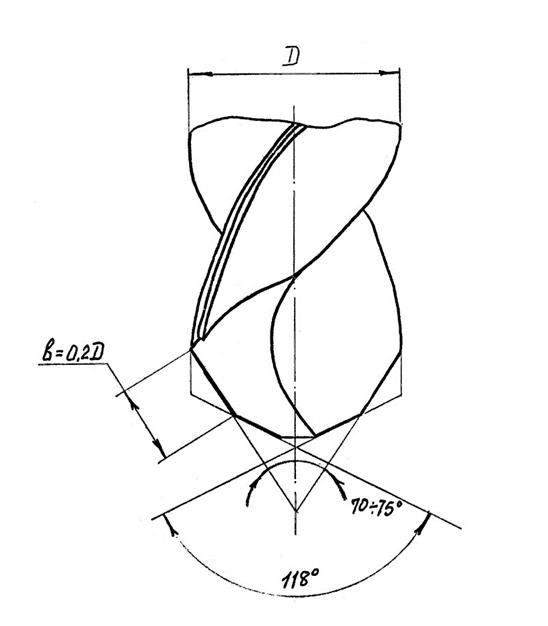 В этом случае на участке ленточки длиной в 3 – 5 мм затачивают задний угол α = 6 – 8°, оставляя цилиндрическую фаску шириной 0,2 – 0,3 мм. Такой прием рекомендуется для обработки вязких материалов, Сверление Æ > 12 мм. Стойкость возрастает в 1,5 раза.
