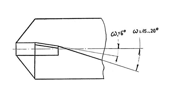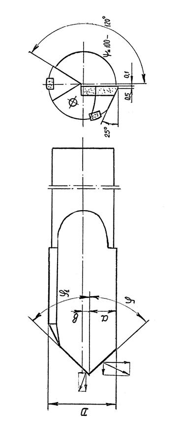 Угол наклона винтовой канавки таких сверл двойной. На режущей пластине ω1 = 6°, а за пластиной ω =15 – 20° (Рис. 58).