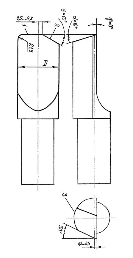 Режущая часть состоит из двух кромок 1 и 2, причем 1 > 2.