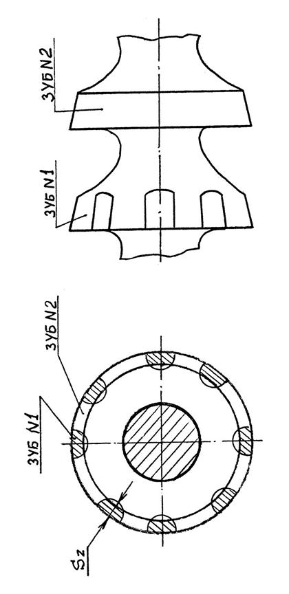Секции протяжки состоят из 2-х зубьев одного диаметра. Режущая кромка 1-го зуба (прорезного) дуговыми выкружками разделена на 8 равных частей. Площадь слоя, срезаемого 1-ым зубом, заштрихована. Второй зуб (зачистной) выкружек не имеет и его лезвие срезает ту часть слоя, которую не срезал 1-ый зуб. Такая схема резания обеспечивает меньшую величину тяговой силы при протягивании. К недостаткам схемы переменного резания относится меньшая стойкость протяжек.