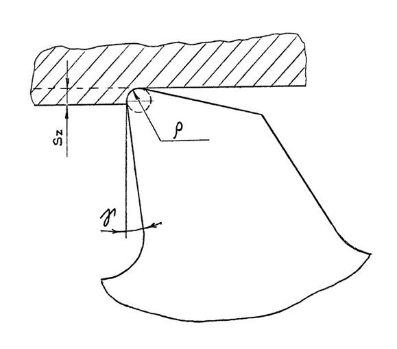 Величина подъема на зуб SZ зависит от схемы резания, обрабатываемого материала, формы протягиваемого отверстия и лежит в пределах от 0,02 до 0,3 мм. Минимально допустимый подъем на зуб определяется величиной радиуса округления зуба протяжки. (Рис. 74).