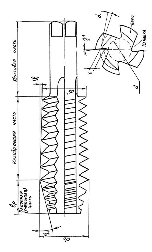 Рабочая часть метчика состоит из заборной (режущей) части и калибрующей части, которая служит для зачистки резьбы. Хвостовая часть предназначена для закрепления метчика в воротке или патроне станка (Рис. 75).