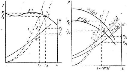 В результате чаще всего наблюдается одновременное пропорциональное изменение характеристик как сети, так и нагнетателя. При этом точка II,характеризующая его работу при уменьшенном объемном весе газа, лежит на одной вертикали с точкой I, характеризующей работу нагнетателя при стандартном объемном весе газов в сети (рис.4.7,2).