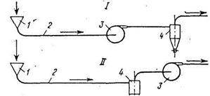 I – с пропуском смеси через вентилятор; II – с отделением продукта до вентилятора; 1 – продуктоприемник; 2 – транспортная сеть; 3- вентилятор; 4- продуктоотделитель.