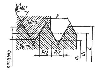 Основные геометрические параметры резьбы (рис 2.1): наружный диаметр d, D (по стандартам диаметры наружной резьбы обозначают строчными, а диаметры внутренней резьбы — прописными буквами. На Рис.2.1 показаны размеры только для винта); внутренний диаметр d1; средний диаметр d2, D2 — диаметр воображаемого цилиндра, на поверхности которого толщина витка равна ширине впадины; угол профиля