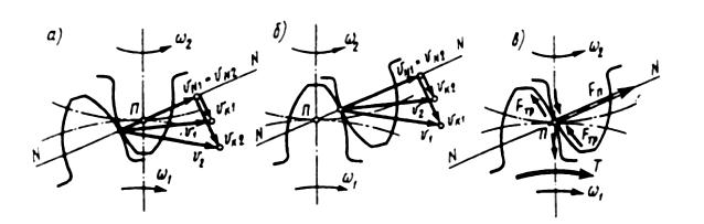 (рис. 3.15, б), причем в обоих случаях vк головки зуба больше, чем у сопряженной с ней ножки. Следовательно, активная поверхность головки зуба является опережающей, а ножки зуба — отстающей. Направление сил трения у зубьев ведущего и ведомого колес показано на рис.3.15, в.