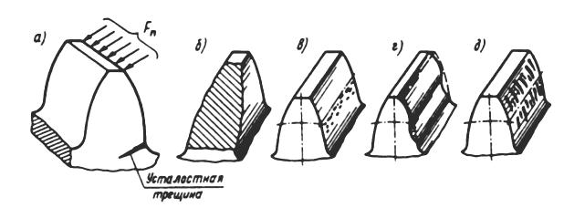 Повторно-переменные контактные напряжения и силы трения приводят к усталостному изнашиванию активных поверхностей зубьев. Как было установлено, сопротивление усталостному изнашиванию, у опережающих поверхностей выше, чем у отстающих, поэтому нагрузочная способность головок зубьев выше, чем ножек. Этим объясняется отслаивание и выкрашивание частиц материала на активной поверхности ножек зубьев (рис. 3.16, в) при отсутствии видимых усталостных повреждений головок. Усталостное изнашивание активных поверхностей зубьев характерно для работы закрытых передач.