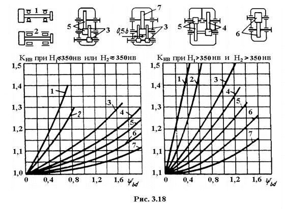 Каждая из кривых графиков соответствует определенному положению колес относительно опор валов; цифры у кривых соответствуют передачам, указанным на схемах; кривые 7 и 2 для случаев консольного расположения колес на валах, опирающихся соответственно на шариковые и роликовые подшипники качения. Графики разработаны для наиболее распространенного на практике режима работы с переменной нагрузкой и окружной скоростью v < 15 м/с. При постоянной нагрузке и твердости хотя бы одного из колес Н < 350 НВ и скорости v < 15 м/с происходит полная приработка зубьев; при этих условиях принимают