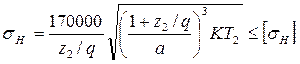 где z2 — число зубьев червячного колеса; q — коэффициент диаметра червяка; а — межосевое расстояние; Т2 — вращающий момент на валу червячного колеса; [σн]— допускаемое контактное напряжение; К — коэффициент нагрузки: при постоянной нагрузке К = 1, при переменной нагрузке К = 1,1... 1,3 (большие значения для высокоскоростных передач). Коэффициент нагрузки при расчете червячных передач сравнительно невелик, так как они работают плавно, бесшумно и хорошо прирабатываются.