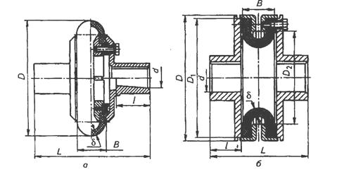 трение, величина которого мала, так как толщина пластин небольшая. При небольших и средних нагрузках применяют преимущественно муфты с неметаллическими (чаще всего резиновыми) упругими элементами, работающими на сжатие, сдвиг или более сложную деформацию. Такие муфты относительно просты и характеризуются высокой демпфирующей способностью, но имеют меньшую нагрузочную способность по сравнению с пружинными муфтами, так как неметаллические упругие элементы недолговечны и с течением времени меняют свои механические характеристики.