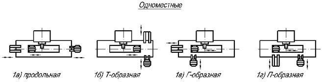 Одноместные загрузочные устройства располагают вдоль продольной оси станка по обе стороны его стола (схема 1а). Цикл смены заготовки включает в себя прямолинейное перемещение стола станка к свободному загрузочному устройству для переустановки на него стола-спутника с обработанной деталью, а затем к другому загрузочному устройству, на котором находится стол-спутник с очередной заготовкой. Для сокращения времени смены заготовки можно использовать дополнительные подвижные каретки, которые при смене стола-спутника одновременно подводятся с двух сторон к зафиксированному в центральной позиции столу станка. Однако в этом случае конструкция загрузочного устройства усложняется.