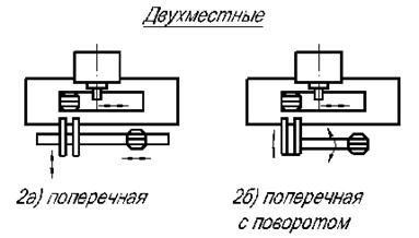 Двухместные загрузочные устройства в отличие от одноместных имеют две платформы с направляющими для установки на них столов-спутников. При этом платформы имеют собственный общий привод, обеспечивающий либо маятниковый цикл движений вдоль продольной оси станка (схема 2 а), либо поворотное движение на угол 180˚ относительно вертикальной оси (схема 2 б).