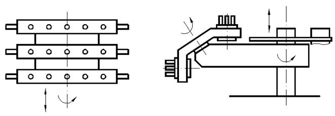 Для рычажных устройств характерно двурукое исполнение: два манипулятора, которые установлены на общей каретке, перемещаемой по направляющим траверсы, совершают возвратно-поступательные движения, всегда находясь в противоположных позициях (схема 2 б). При этом один манипулятор оперирует заготовками, а другой – деталями. Для одновременного манипулирования заготовкой и деталью манипулятор может быть двухзахватным с дополнительным поворотным движением головки относительно оси руки на угол 180˚ (схема 2 а).