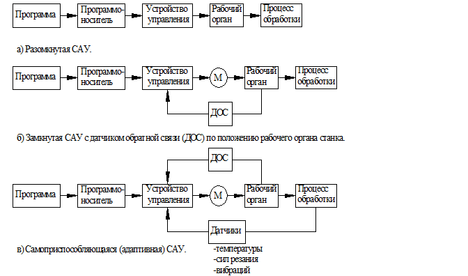 При первом варианте исполнения САУ (рис. а) программа управления, воплощенная в программоноситель, вводится в управляющее устройство, которое осуществляет управление рабочими органами станка. САУ в этом исполнении не контролирует, как в действительности обрабатывается программа управления.