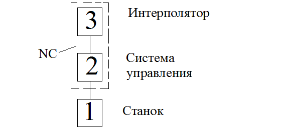Применяемые в настоящее время в промышленности системы ЧПУ класса NC построены по принципу цифровой модели. В этой системе программа (на перфоленте) вводится в интерполятор 3, далее переработанная