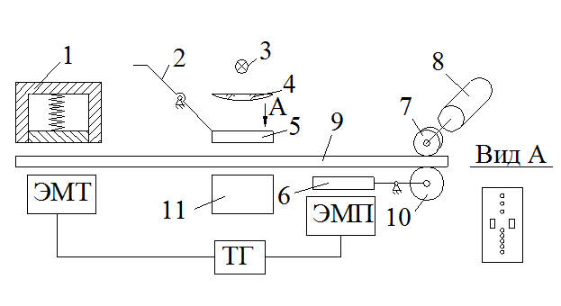 Протягивание перфоленты 9 производится приводным роликом 7, к которому она поджимается роликом 10, при включении электромагнита протяжки (ЭМП) и притягивания якоря 6. Приводной ролик 7 вращается электродвигателем 8. При протягивании перфоленты для ее натяжения и плотного прилегания к фотосчитывающей головке 11 она подтормаживается тормозом 1 и прижимается к головке 11 прижимом 5, который при заправке перфоленты отводится рычагом 2. После считывания информации одного кадра перфолента останавливается включением тормоза ЭМТ и отключения электромагнита ЭМП. Синхронизация их работы осуществляется управляющим триггером (ТГ).