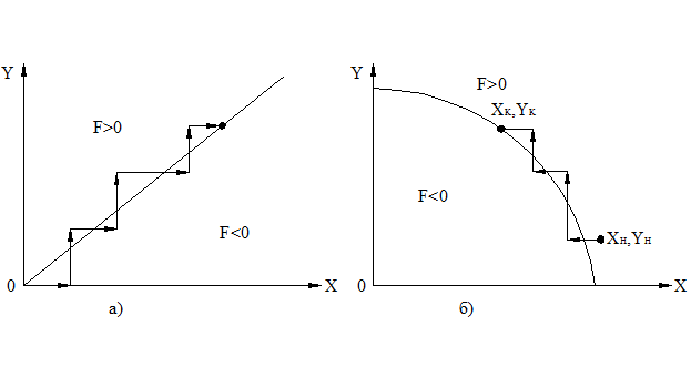 Если промежуточная точка траектории находится в области F>0, то следующий шаг делается по оси Х. Если же промежуточная точка находится в области F<0, шаг делается по оси Y. Аналогично происходит работа интерполятора при круговой интерполяции (см. рис. б).