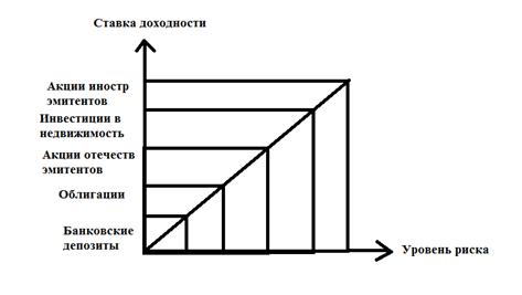 Инвестирование в отдельные активы, например, банковские депозиты, облигации, акции отечественных эмитентов, в недвижимость или акции иностранных эмитентов, обеспечивают характерное для каждого актива определенное соотношение уровня риска и ставки доходности. Как видно из рисунка, относительно меньший риск сопровождает активы в форме банковских депозитов. Основная причина этого заключается в относительно низкой ставке доходности инвестированного капитала, тогда как самая высокая ставка доходности по акциям иностранных эмитентов связана с наибольшим уровнем риска.