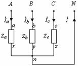 Трехфазная нагрузка, фазы которой Za, Zb, Zc соединены по схеме звезда, представлена на рис. 29. Аналогично могут быть соединены обмотки (фазы) трехфазного генератора.