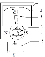 Прибор выводами 6 подключается в измерительную цепь. В рамке 4 возникает ток. Одним из выводов рамки является спиральная пружина 5. По закону Ампера на рамку с током со стороны магнитного поля созданного магнитопроводом 1 будет действовать сила: