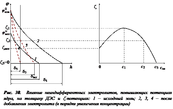 При малых концентрациях электролита преобладает первая тенденция. Адсорбция потенциалопределяющих ионов продолжается до достижения предельной адсорбции и z-потенциал по абсолютному значению возрастает. После достижения предельной адсорбции потенциал ядра остается неизменным, но за счет влияния индифферентных противоионов ДЭС сжимается,