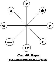 Окраска золя обусловлена частичным пропусканием света соответствующей длины волны. Золь всегда окрашен в цвет, дополнительный к поглощенному. Пропущенный и поглощенный световые потоки, составляющие вместе белый цвет, называются парами дополнительных цветов (рис. 48).