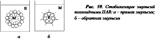 Гидрофильные порошки (мел, глины, каолин) стабилизируют прямые эмульсии М/В. Гидрофобные частицы (графит, угли, канифоль) являются стабилизаторами обратных эмульсий В/М.