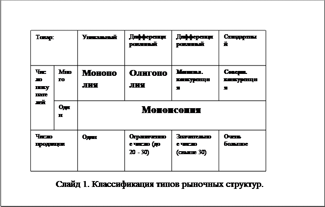 Экономисты различают 4 довольно несхожие рыночные ситуации: чистую конкуренцию, чистую монополию, монополистическую конкуренцию и олигополию. Данные четыре модели рынка заметно отличаются по количеству фирм в отрасли, независимо от того, является ли продукция стандартной или дифференцированной и каковы барьеры на входе в отрасль.