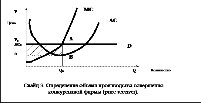Выбор оптимального объема производства совершенно конкурентной фирмы, максимизирующей прибыль, определяется в 2 этапа: определяется оптимальный объем производства; фирма решает, производить ли вообще. Оптимальный объем производства определяется точкой пересечения кривых предельных издержек (MC) и предельного (совпадающей с кривой среднего) дохода. Абсциссе этой точки на координатной плоскости (Q0) соответствует минимум функции средних издержек (АС). Решение о производстве или выходе фирмы из отрасли основывается на сравнении величин средних издержек на единицу выпуска при оптимальном объеме производства (AC(Q0)) и уровне рыночной цены. В случае, если средние издержки (себестоимость продукции) ниже уровня цены (P), фирме имеет смысл производить и она получит прибыль, равную площади заштрихованной фигуры на приведенном слайде 23. В случае, если цена ниже уровня средних издержек фирмы, возможны два варианта. Если такая ситуация имеет место только в краткосрочном периоде и имеется перспектива изменения положения в пользу фирмы в долгосрочном масштабе, имеется целесообразность сохранить производство, применяя стратегию сокращения издержек, либо минимизируя объем производства до момента изменения ситуации в отрасли. В случае, когда имеет место долгосрочное превышение средних издержек над ценой, фирма имеет только одну перспективу прекращения производства и выхода из отрасли.