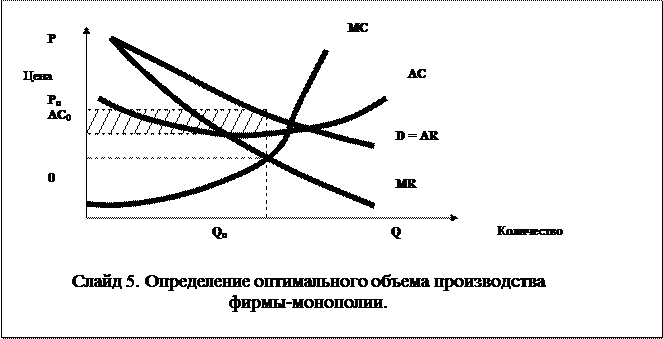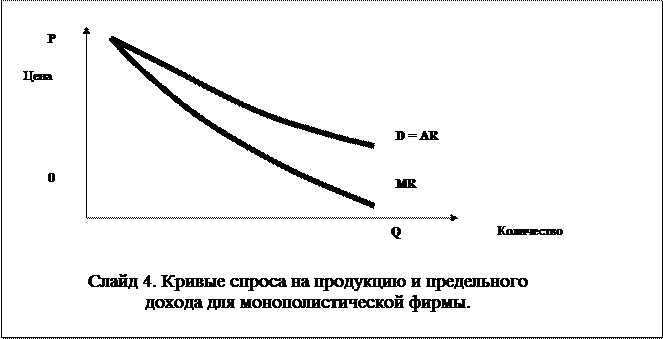 3. Монополист воздействует на рыночную цену, то есть кривая спроса монополиста имеет отрицательный наклон. При этом кривая спроса и среднего дохода (D=AR) проходит выше уровня кривой предельного дохода монополиста (MC).