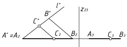Если не строить третью проекцию, то для решения задачи приходится использовать теорему Фалеса. Смысл теоремы в том, что две прямые на плоскости делятся секущими параллельными прямыми на пропорциональные отрезки.