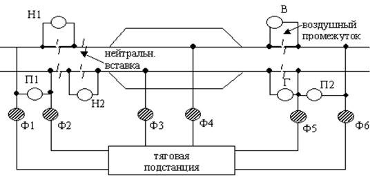 Различают продольное и поперечное секционирование контактной сети. Под продольным секционированием понимается разделение питания контактной сети станции и контактной сети перегонов. Под поперечным секционированием понимается разделение питания контактной сети отдельных путей станции или отдельных путей перегонов. Перед каждой станцией имеется воздушный промежуток. На опорах, ограничивающих воздушный промежуток, имеются черно-белые полосы.