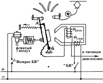 C:\temp8\Ov4innikov\images\20.3.GIF Для включения БВ машинист включает кнопку «БВ», которая остается включенной, замыкая цепь удерживающей катушки БВ. Затем, машинист включает кнопку с самовозвратом «Возврат БВ». Замыкается цепь на катушку электромагнитного вентиля, который пропускает сжатый воздух в пневмоцилиндр. В пневмо-цилиндре поршень перемещается, сжимая пружину, и через шток роликом нажимает на контактный рычаг, который поворачиваясь относительно точки А, прижимается к якорю. При дальнейшем перемещении поршня якорь прижимается к сердечнику, поворачиваясь относительно точки Б. Но силовые контакты остаются разомкнутыми, пока кнопку «Возврат БВ» удерживаем включенной. После отпускания кнопки «Возврат БВ» под действием пружины в пневмоцилиндре поршень перемещается в прежнее положение, освобождая контактный рычаг. Под действием своей пружины контактный рычаг поворачивается относительно точки А, замыкая силовые контакты. Якорь остается притянутым к сердечнику под действием магнитного потока удерживающей катушки. При включенной кнопке «Возврат БВ» силовые контакты не замкнуты для того, чтобы при включении БВ на аварийный режим, БВ не смог бы отключиться. После включения БВ последовательно в силовую цепь включена размагничивающая катушка, магнитный поток которой раздваивается, с одной стороны направлен согласно Фудерж, а с другой – встречно. Соотношение витков катушек таково, что при нормальных условиях якорь остается притянутым. При к.з. в силовой цепи быстро возрастающий ток и магнитный поток размагничивающей катушки размагничивает сердечник и якорь под действием пружины быстро отпадает, размыкая силовые контакты, а образовавшаяся дуга магнитным дутьем выбрасывается на «рога» и гасится. Для уменьшения времени отключения после появления к.з. параллельно размагничивающей катушке включается индуктивный шунт, имеющий индуктивное сопротивление больше индуктивного сопротивления размагничивающего винта. Ток к.з., в основном, идет через размагничивающую катушку. Оперативное отключение и отключение при перезагрузках происходит размыканием цепи удерживающей катушки. Время отключения БВ 0,0015÷0,003 сек., регулируется изменением усилия пружины или перемещением винтов в магнитной системе сердечника. Ток уставки БВ, например, на ВЛ10 А. На ЭПС переменного тока роль, аналогичную БВ, выполняет главный выключатель ГВ (воздушный).