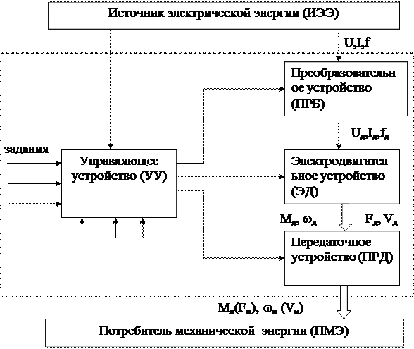 Автоматизированным электроприводом называют электромеханическую систему, состоящую в общем виде из электродвигательного, преобразовательного, передаточного и управляющего устройств и предназначенную для приведение в движение исполнительных органов рабочих машин и управления этим движением (рисунок 3).