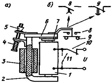 Электромагнитное реле времени (рис. 1) состоит из неподвижной части магнитопровода 2, на котором установлена катушка 1; подвижной части магнитной системы - якоря 6 с контактами 8 и 9. При отсутствии напряжения на катушке якорь 6 с помощью пружины 4 удерживается в поднятом положении.