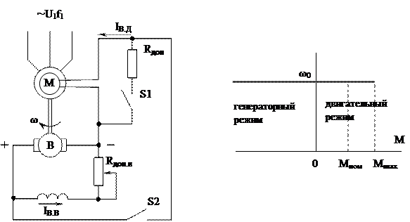 СД может работать в режиме генератора параллельно с сетью, когда нагрузочный момент на валу будет иметь отрицательное значение (для торможения такой режим практически значения не имеет, т.к. при этом нельзя получить понижение скорости).