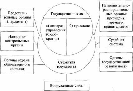 Термин государство используется в двух значениях. В широком смысле государство рассматривается как общность людей, представляемая и организуемая органом высшей власти и проживающая на определенной территории. Отождествляется по существу с такими понятиями как «страна», «общество». В узком смысле государство понимается как организация политической власти, содействующая преимущественному осуществлению конкретных интересов в пределах определенной территории. В этом качестве государство играет особую роль в политической системе, придавая ей своего рода целостность и устойчивость.