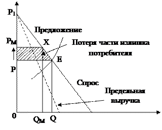 Излишек потребителя максимизируется только при совершенной конкуренции, когда цена устанавливается свободной игрой сил спроса и предложения на рынке и все потребители платят одинаковую цену. Однако если рыночная цена устанавливается максимизирующим прибыль монополистом, то образующиеся в результате этого сокращения объема и роста рыночной цены вызывают потери излишка потребителя (рис. 7.20).