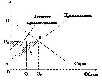 На рис. 7.22 ОРе – равновесная рыночная цена. В каждой точке участка кривой предложения АЕ производители стремятся предлагать определенный объем блага и реализовывать его по цене ОРе, т.е. выше той, по которой они были готовы реализовать свои блага. Так, один продавец намерен реализовывать объем ОQ1 своего блага по цене OP1 при практической цене блага, равной OP1. В результате он получил бы излишек P1Pе. Общий излишек равен АРеЕ (на рис. 7.22 заштрихованная площадь).