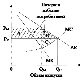 В условиях монополии если цена выше, то покупатели приобретают меньше продукта. Те покупатели, которые приобретают товар по более высокой цене, теряют часть излишка (прямоугольник А), а покупатели, которые не могут приобрести товар по цене Рм, но приобрели бы его по цене Рс, тоже теряют излишек (треугольник В). Таким образом, общая потеря потребительского излишка равна А + В. В то же время производитель извлекает прибыль, обозначенную прямоугольником А, реализуя товар по более высокой цене, однако теряет часть излишка, обозначенную треугольником С, представляющую собой дополнительную прибыль, которую производители получают от реализации объема выпуска (Qс – Qм) по цене Рс. Следовательно, общая прибыль производителя равна А - С. Вычитая потерю потребительского излишка из прибыли производителя, получаем чистые убытки, равные В + С; Это полные чистые убытки от монопольной власти. Общие чистые убытки – это общественные издержки неэффективности из-за более низкого объема производства при монополии в сравнении со свободной конкуренцией.