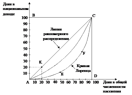 Кривая Лоренца представляет собой промежуточную кривую AEFC и дает представление об отклонении от абсолютного равенства, т. е. показывает меру неравенства в распределении доходов. Чем больше изгибается кривая Лоренца, тем сильнее неравенство. Прямая АС, проведенная под углом 45°, говорит об абсолютном равенстве в распределении доходов. Точка В – точка абсолютного неравенства, когда весь национальный доход присваивается весьма узкой группой населения. Самое крайнее положение занимает линия номинального распределения доходов, отражающая наибольшее неравенство. Прогрессивные системы налогообложения обычно смягчают это неравенство.