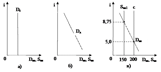 Спрос на деньги для сделок изменяется пропорционально номинальному ВНП согласно формул Dt × V = ВНП, где V – скорость обращения денег. Если V – const, то Dt есть возрастающая функция от номинального ВНП, Поскольку Dt зависит от уровня номинального ВНП и не зависит от процентной ставки, то графически он отображается в виде вертикальной линии (рис. 16.1а).