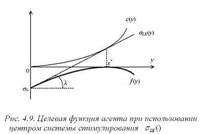 Таким образом, при выпуклых функциях затрат агента эффективность пропорциональных систем стимулирования не выше, чем компенсаторных. График целевой функции агента при использовании центром пропорциональной системы стимулирования приведен на рис. 4.7.