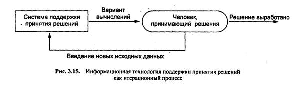 Главной особенностью ИТ поддержки принятия решений является качественно новый метод организации взаимодействия человека и компьютера. Выработка решения, что является основной целью этой технологии, происходит в результате итерационного процесса (рис. 3.15), в котором участвуют: