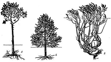 | Рис. 25. Болотные формы сосны: А – f. litwinowii Sukacz.; Б – f. wilkommii Sukacz.; В – f. pumila Abolin. |